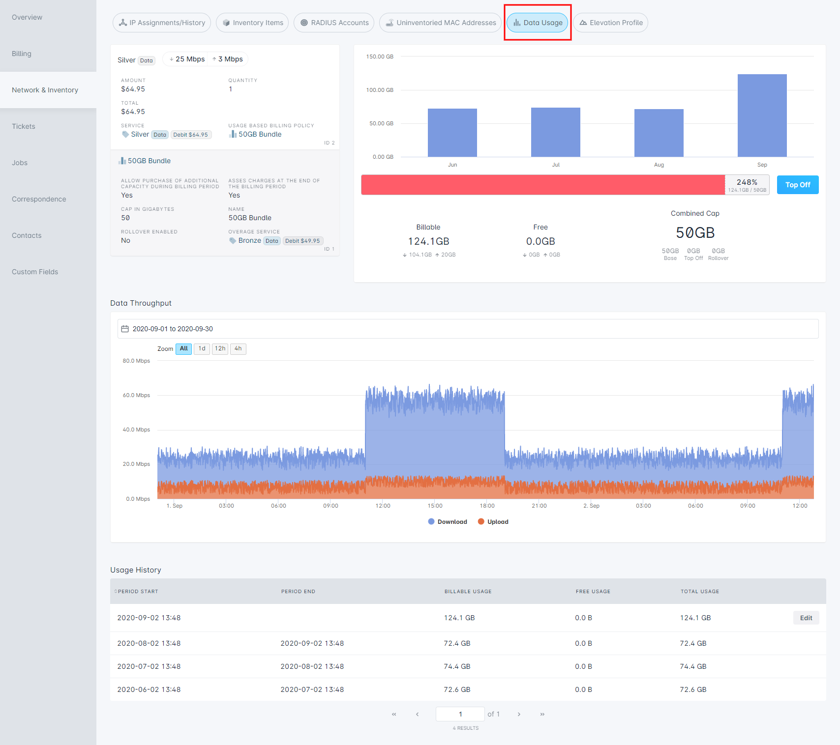 This graph shows how much data the account has used. It includes billable usage, any free usage (if allowed), and the data cap. If the policy allows it, you can click “Top Off” to add more data during the billing cycle.