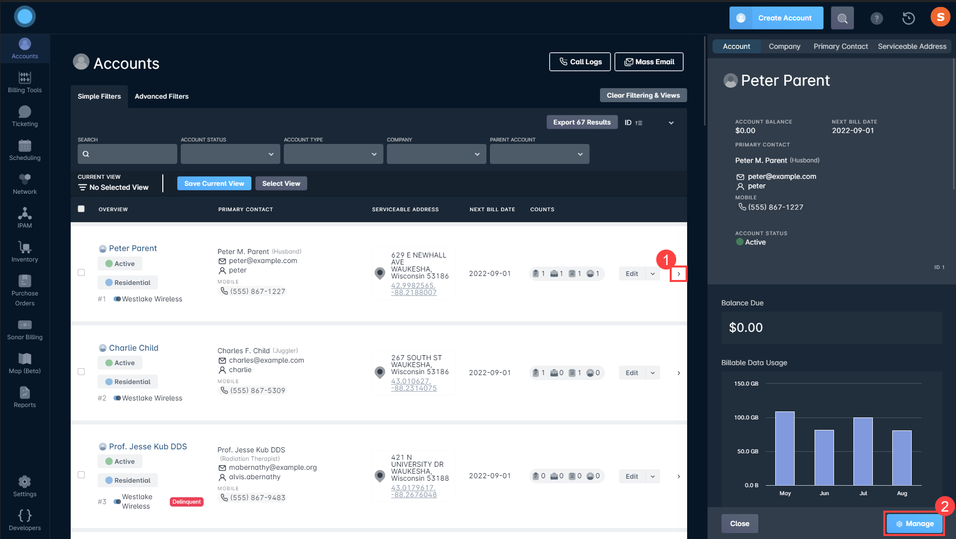 The Data Usage tab shows the account’s data usage, but only if your Sonar setup collects usage data from the network. In the top-left, you’ll see details about the data service and any usage-based billing policy. A graph on the right displays billable data usage. Below that, you can pick a date range to view data throughput, and at the bottom, there’s a detailed usage history table.