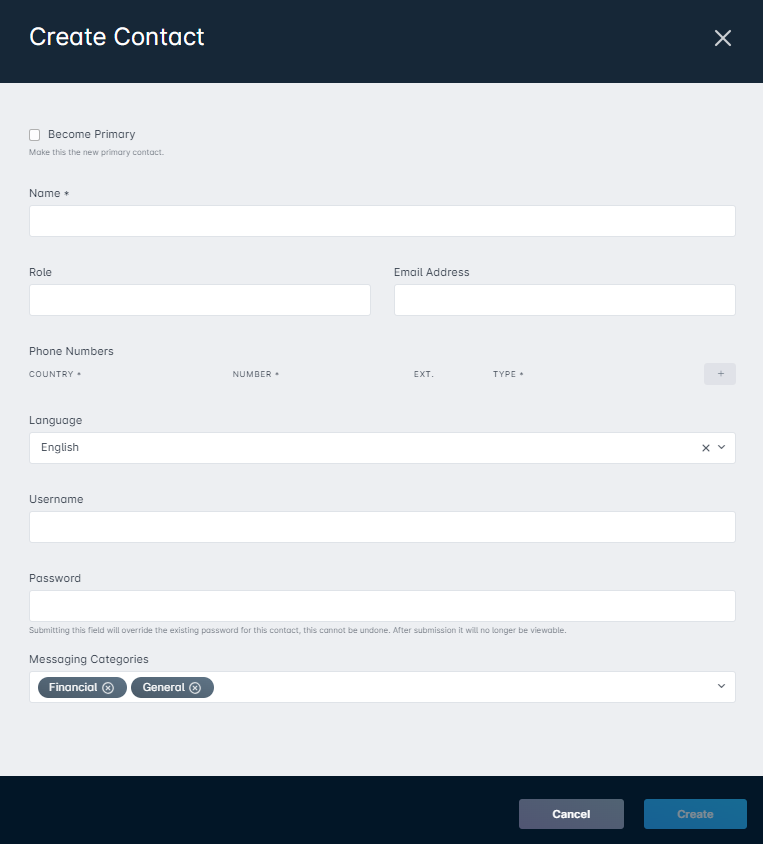 Clicking “Create” opens the contact setup window. Here, you can enter the contact’s name, role, email, language, and more. If portal access is enabled, you’ll also set a username and password. Use the “Message Categories” dropdown to choose which emails the contact should receive—default categories will appear automatically but can be removed if needed.