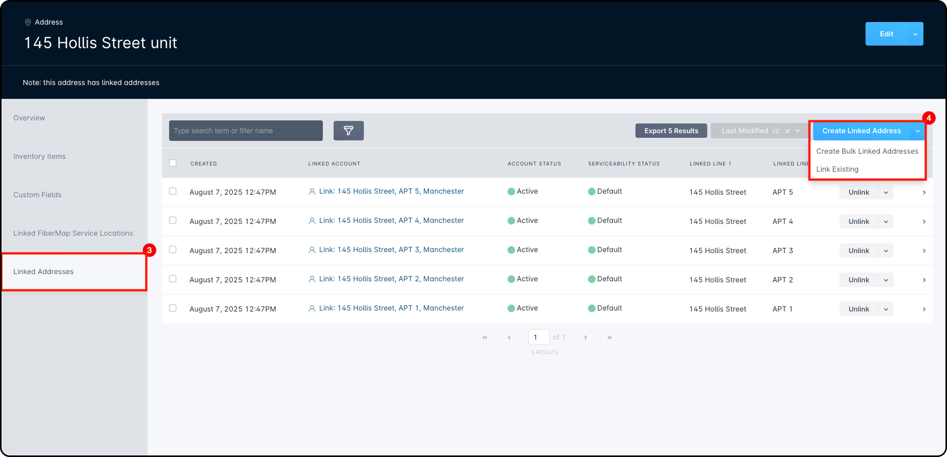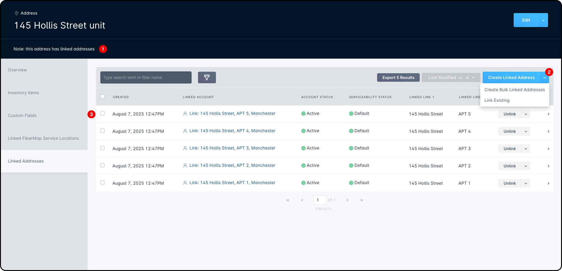 As you roll out service to large apartment buildings, creating each address and linking them individually will eat up your valuable time. This is especially true for deployments where the number of units can grow to 50 or more. When you're defining this sort of property, you can leverage the Bulk creation tool to quickly add and increment the various Linked Addresses.