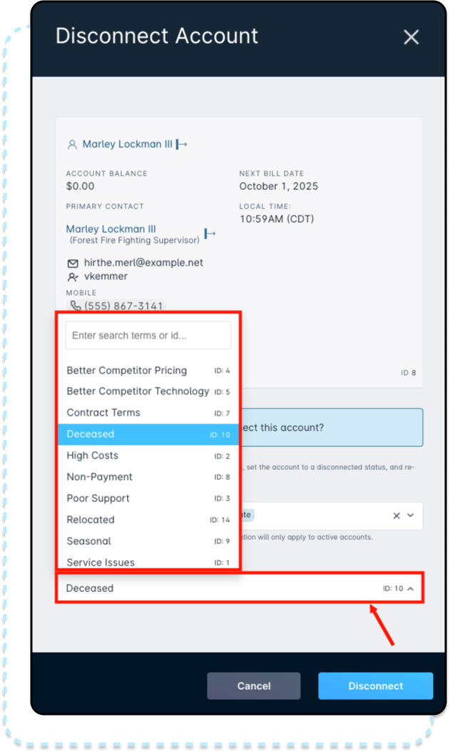 There are three workflows for disconnecting an account, which will provide you the ability to select and track the Disconnection Reason. We will walk through each workflow below to show you how and when you are prompted to provide that information.