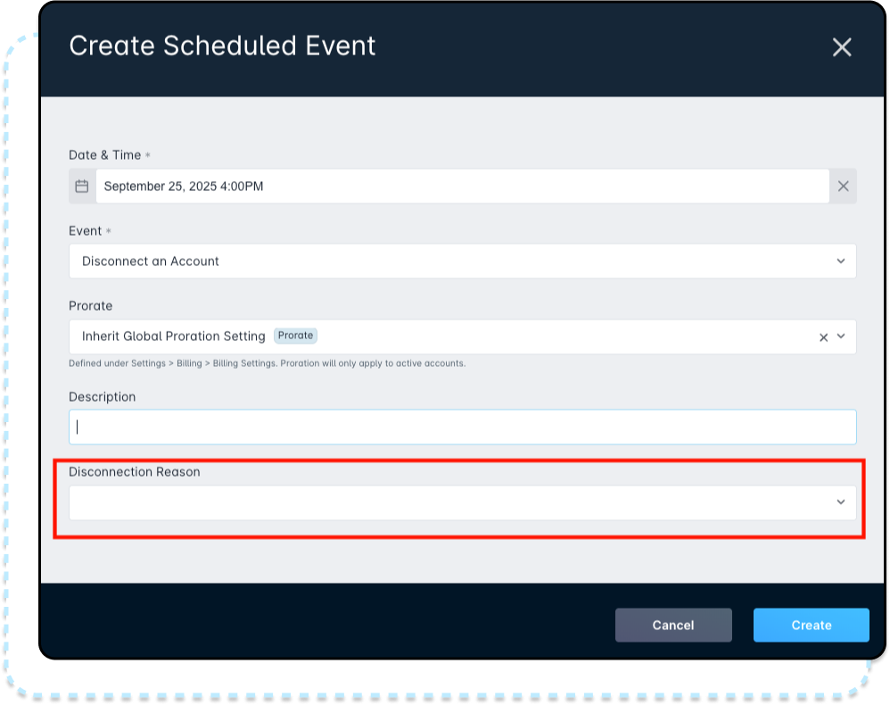 - To use Scheduled Events to disconnect an account, navigate to the Account Overview page, and click Create Scheduled Event. In the Create Scheduled Event modal, once you select the Event for “Disconnect an Account,” you'll find the Disconnection Reason field at the bottom.