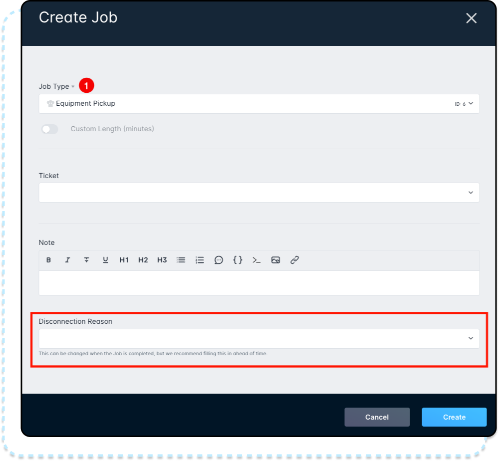 - To use a Job to disconnect an account, navigate to Jobs within the subscriber's account and click Create Job. In the Create Job modal, once you select the Job Type for disconnecting an account, you'll find the Disconnection Reason field at the bottom.