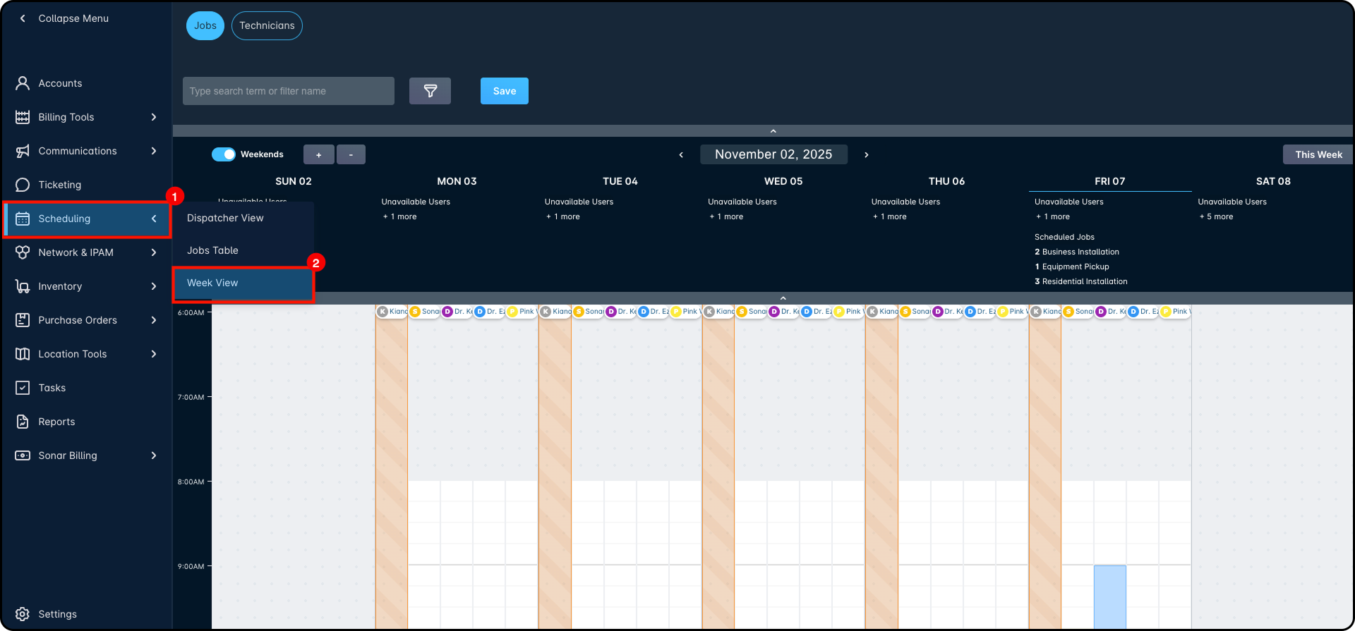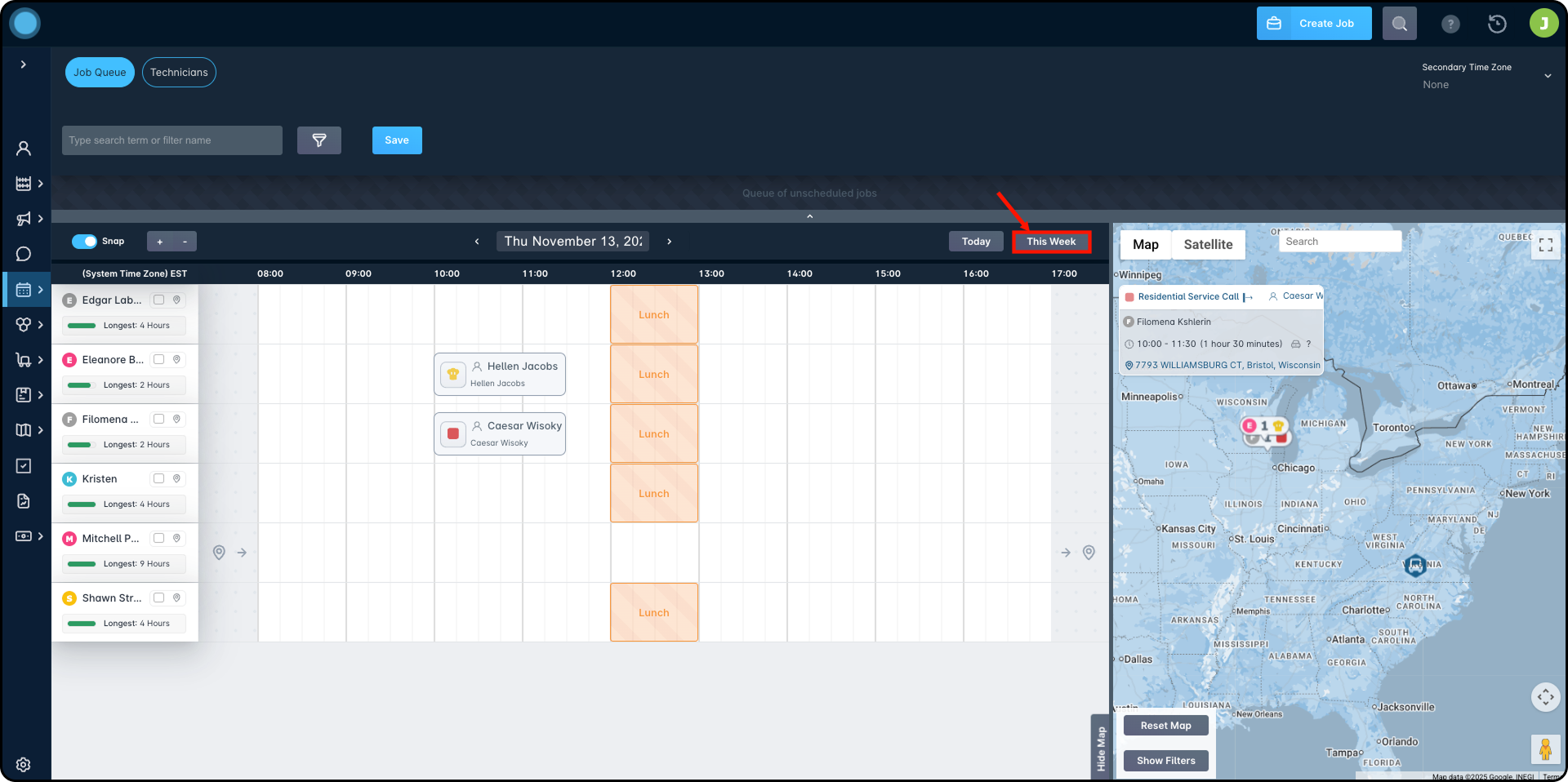 The filtering for the Week View, much like the Dispatcher View, takes place across 2 different subsections – Job and Technicians.