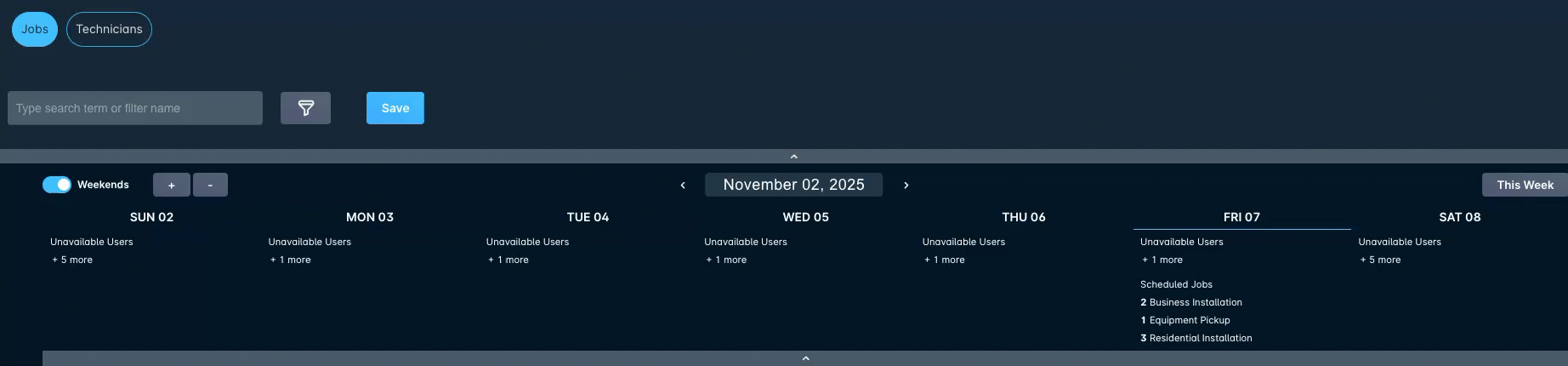 - The Weekends toggle allows you to control whether Sunday and Saturday will be displayed on the calendar. If your organization doesn't schedule jobs over the weekend, this toggle can be disabled, and the calendar will only show the 5 weekdays.