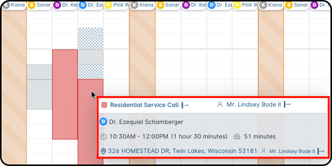 - Hovering over a job in the calendar will display a pop-up, showing information about the job.