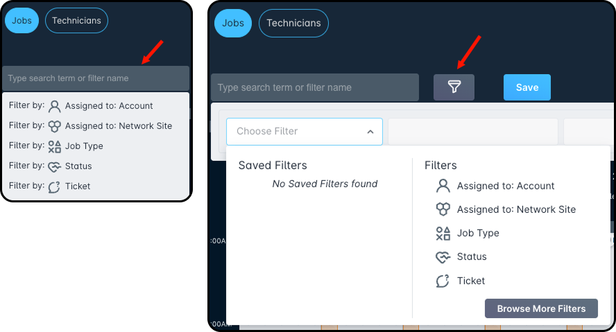 - The Job/Technician toggle allows you to switch between the available filtering panels, which will affect the filter list.