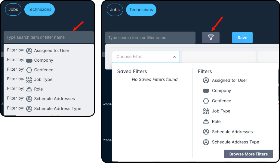 - Geofence; which will show technicians based on the Geofences they've been assigned to.This filter touches on the Geofences section of the Job Type configuration, defined under Settings → Scheduling → Job Types.