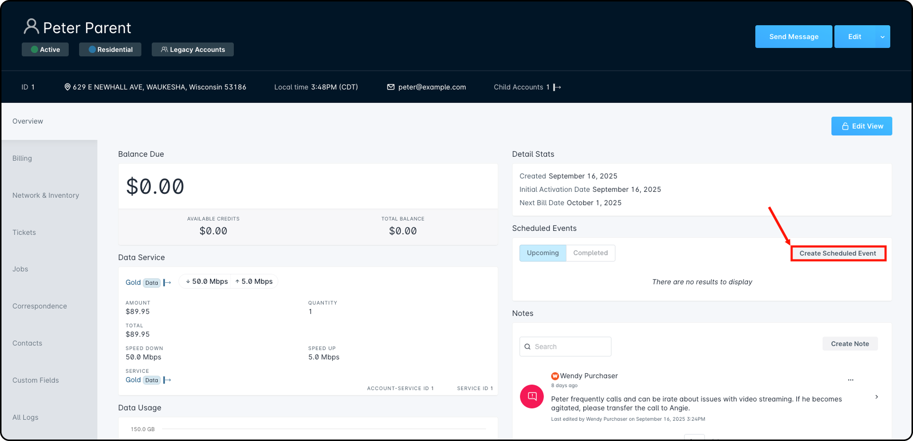 Using the “Add a service” Scheduled Event, you can automate placing a new Service on an Account, or, in the case of Data Services, automatically change the Service associated with the Subscriber. In this example, the Subscriber is requesting a service upgrade at the start of their next billing cycle that won't require technician intervention. These straightforward changes highlight the strengths of Scheduled Events.