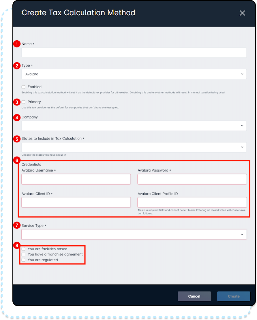 - The checkboxes alongside You are facilities based, You have a franchise agreement, and You are regulated are to be used as directed by Avalara.