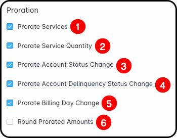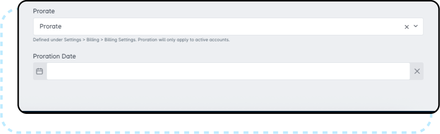 - The Prorate Billing Day Change checkbox allows you to prorate any amount due as a result of a change in billing day, made through either customer request or for company requirements — such as migrating all customers to a first of the month billing cycle.