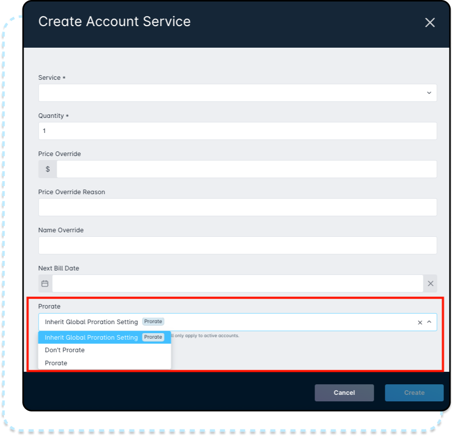 - The Prorate Account Status Change checkbox allows you to make account changes on a customer's account, such as canceling a customer account, and the remaining bill amount will automatically be refunded to the account's payment method.