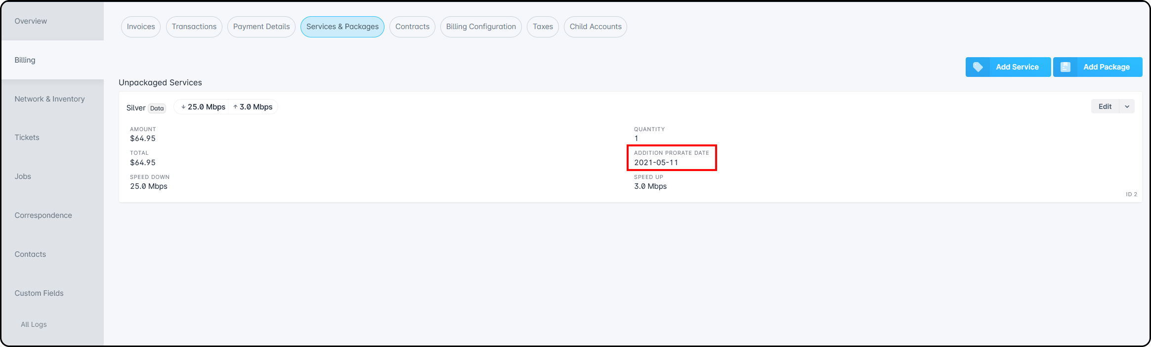 When adding a service, you can view the Proration Date on the “Services & Packages” page:
