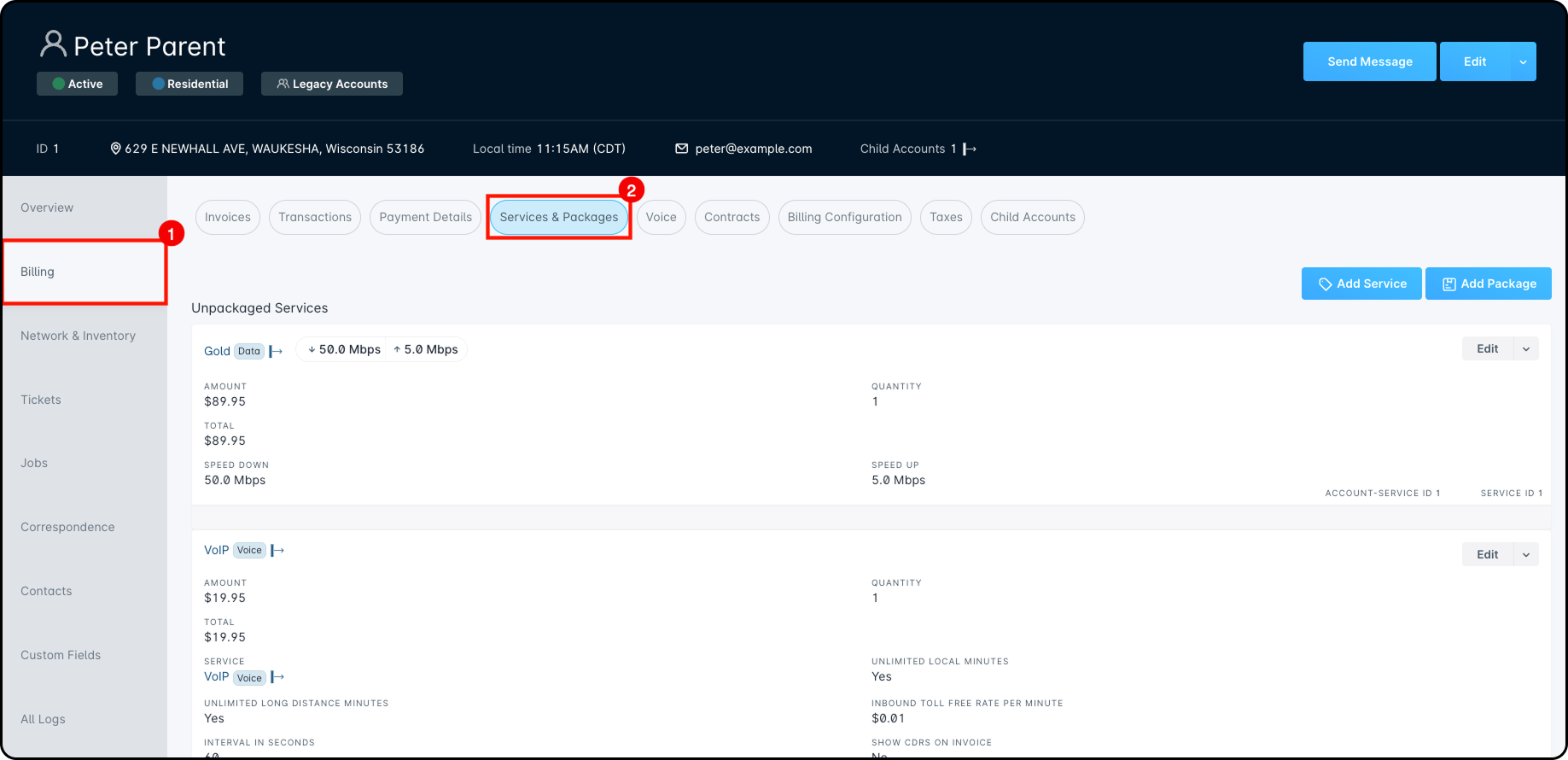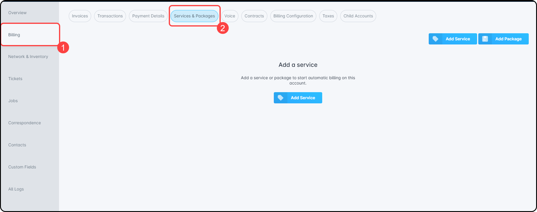 Next, navigate into the Billing tab and select the “Services & Packages” sub-tab: