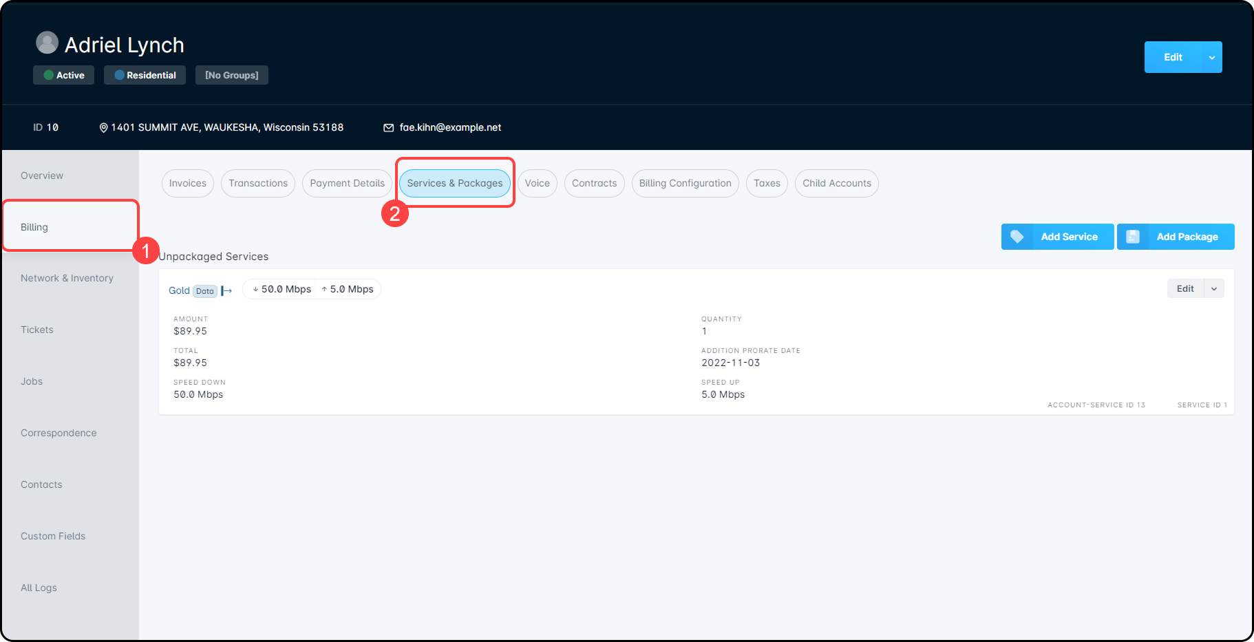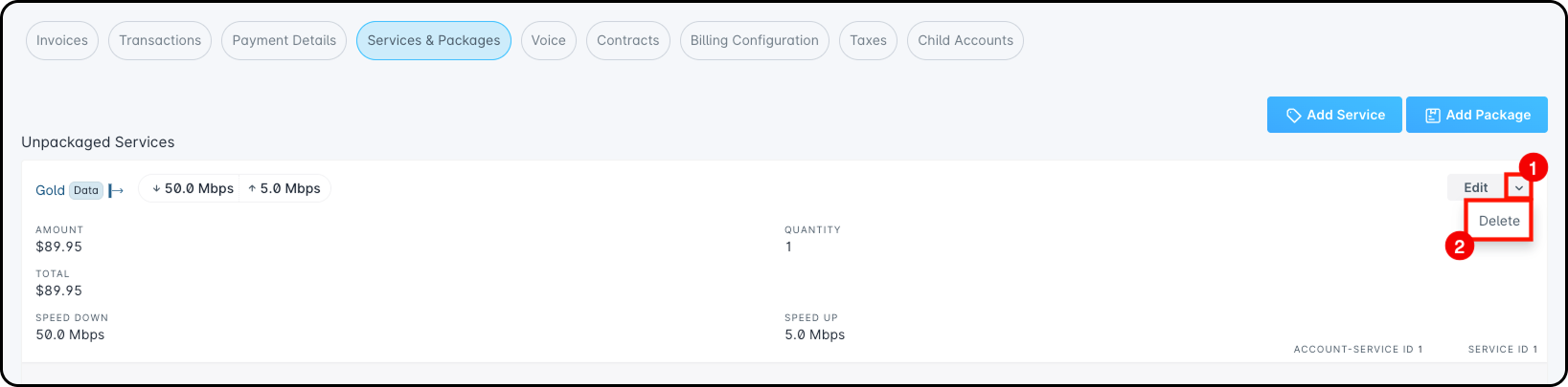 The Services & Packages page presents a list of services that the customer currently has applied to their account. We'll be removing the active service on this account, and adding a new one in a later example. To remove a service, click on the dropdown arrow next to the “Edit” button and select “Delete”: