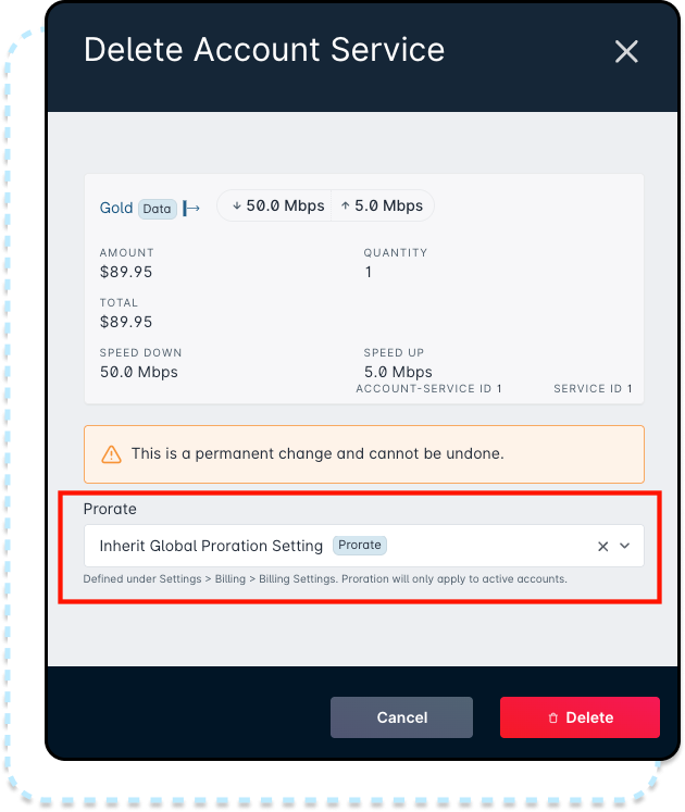 From the “Delete Account Service” modal that appears, we'll be making sure that the “Prorate” box is checked: