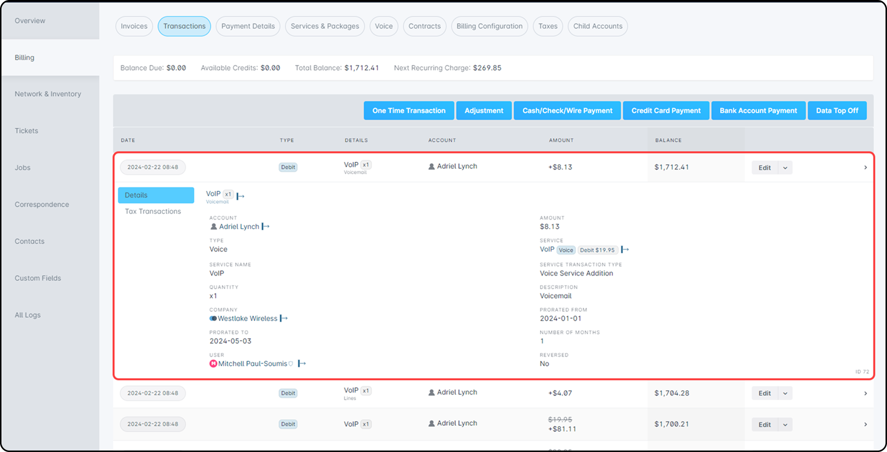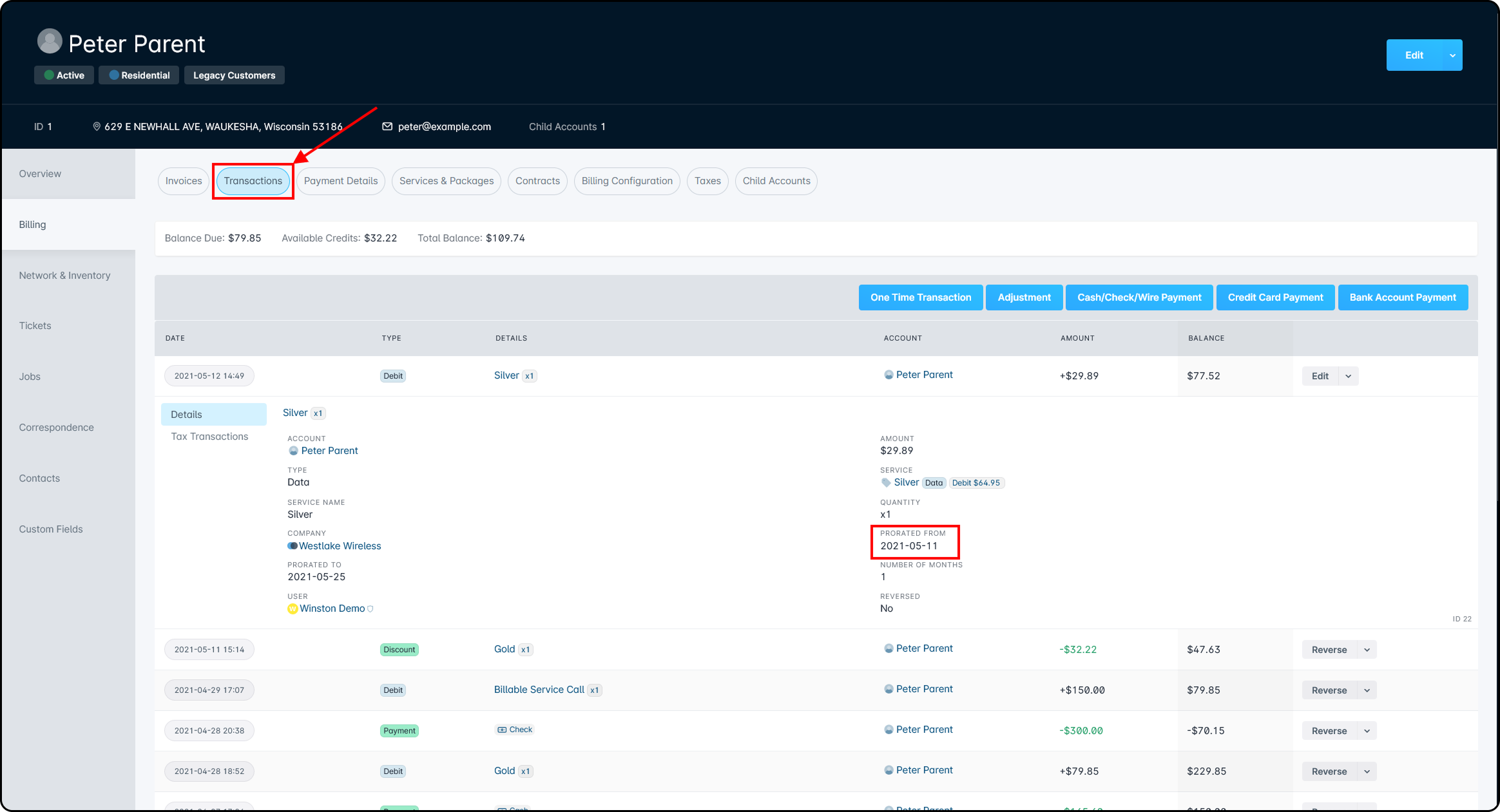 Here we can see the Proration Date, which we can view in more detail on the “Transactions” section of the Billing tab: