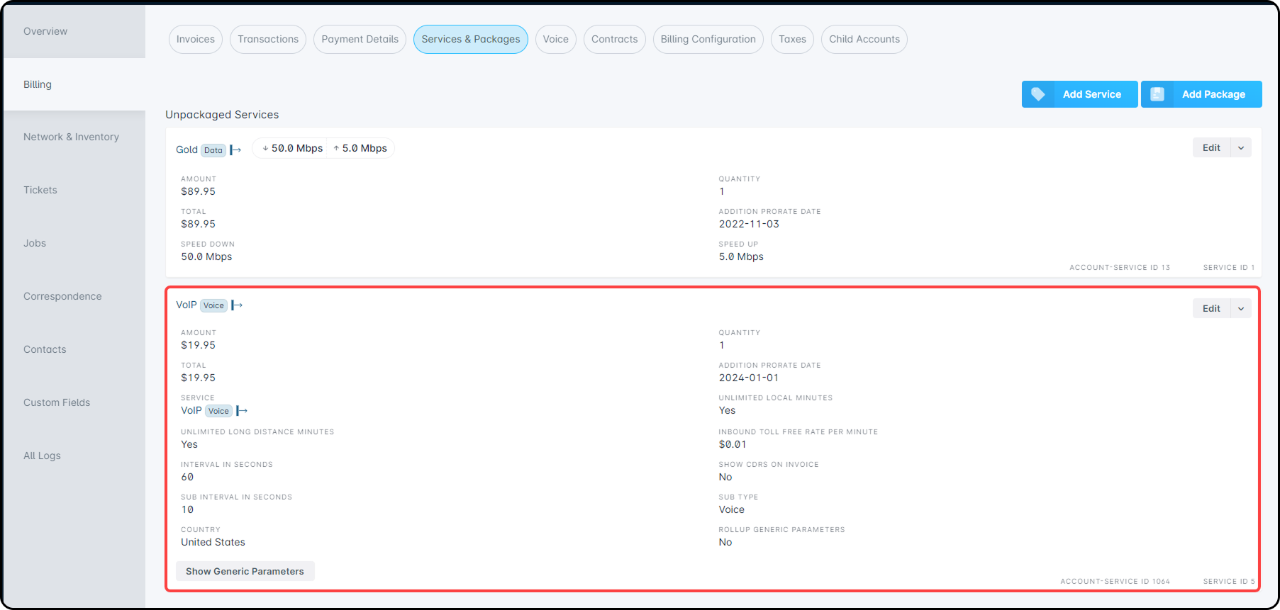Peter Parent's accounts has this Gold Voice service applied and currently has a quantity of 2 for the Lines Generic Parameter. If Peter were to call in and say he only needs 1 line going forward, then modification of the Generic Parameters would be required. Navigate into Peter's account, click the Billing tab, and under the Services & Packages sub-tab, locate the “Gold Voice” service and click “Show Generic Parameters”. From here, locate the Lines parameter and use the “Edit” button to change the quantity. When changing the quantity, an option will be provided to prorate this change, which would only take effect on Peter's account.