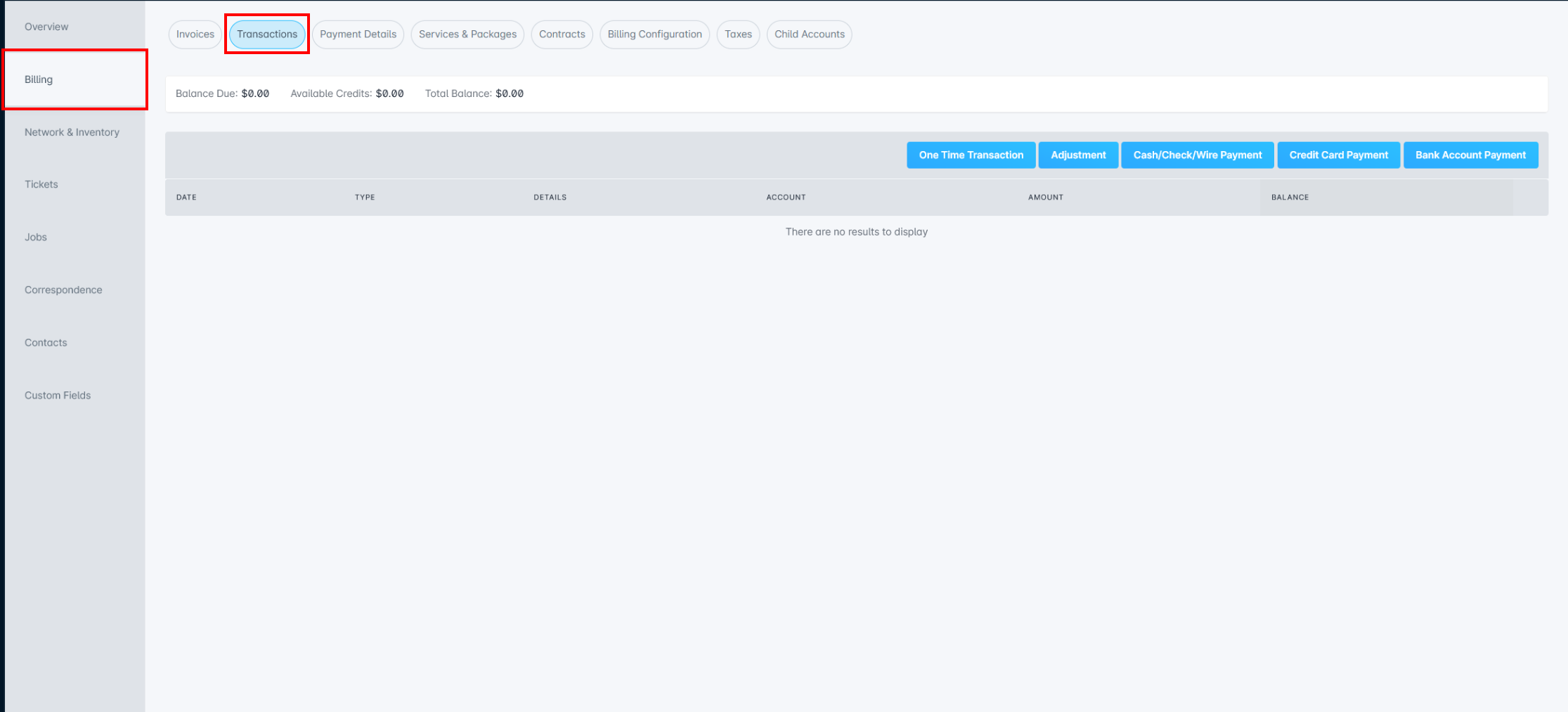- From any Account Management View, as long as the Account's service has a Usage Based Billing policy enabled, go to the Billing Tab, then the Transactions sub-tab: