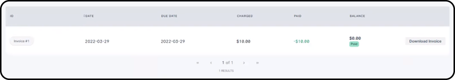 The invoices displayed here will be your instance invoices. Each line item displays the invoice number and some basic details about the invoice, such as the date and amount; you're able to save a further breakdown by clicking Download Invoice on the corresponding line item.