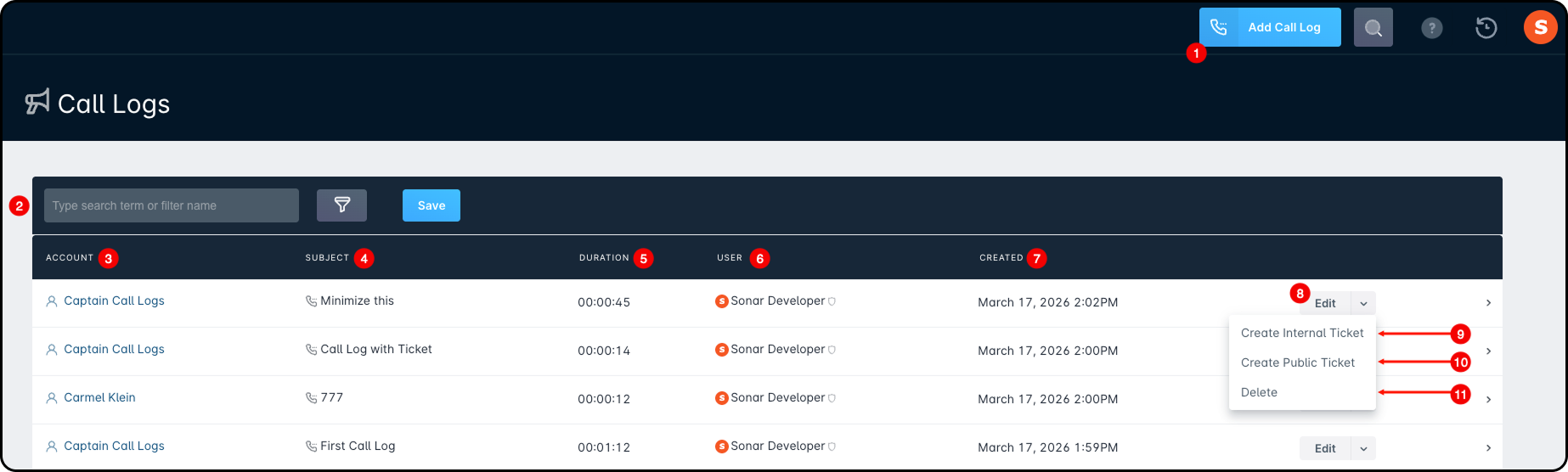 Navigate to Communications > Call Logs to view all recorded calls in your instance. From this page, users can review saved call logs, create a new call log, convert call logs into tickets, and perform other actions based on their role permissions.
