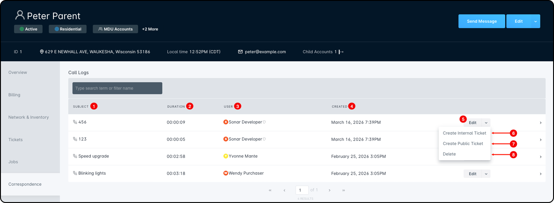 Call logs help users capture important details while speaking with a subscriber and save that information directly to the correct account. They can also be turned into tickets for easier issue tracking and follow-up.