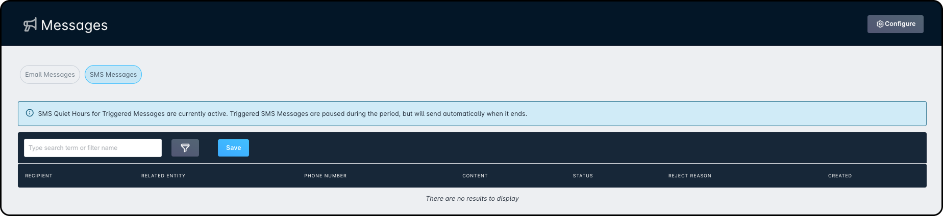 Once added and saved, any Triggered Messages will remain in a “Pending” status, viewable by navigating to Communications → Messages → SMS Messages.