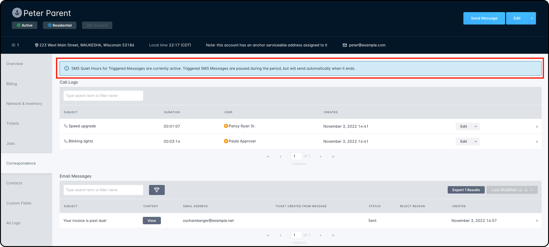 Quiet Hours let you set a time range when Triggered SMS Messages should not be sent. To set them up, go to Settings → Sonar Billing → SMS and enter a Start and End time. These times always use your system time zone.