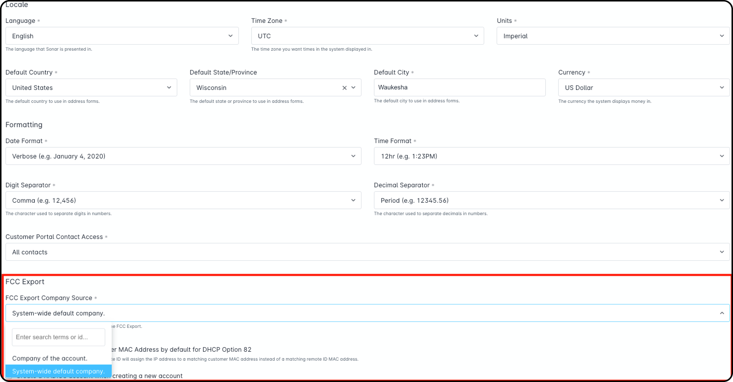 Sonar lets you choose how accounts appear on your FCC Form 477 report: either all accounts under your default company or under the company each account belongs to.