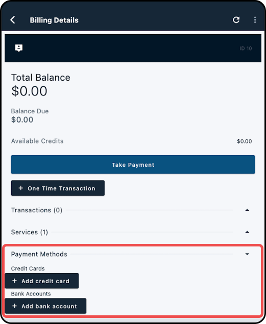 7. Scroll up to the Billing Details section, expand the "Services" dropdown, and tap "Add Service"