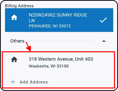 11. The account's associated serviceable address will be populated within the Billing Address section; if the account has a separate mailing address, it will be available to be selected by tapping "Others", as will the option to add a new address.