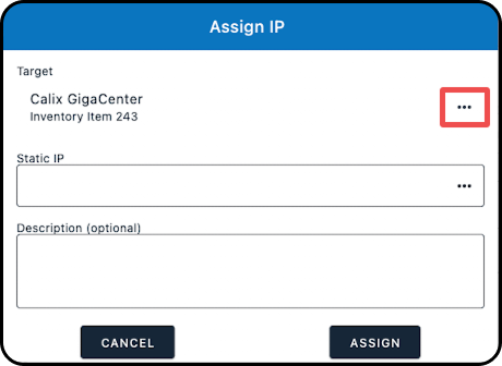 7. Within the Assign IP window that appears, select the 3 dot menu (located under Target), to open the IP Assignable Chooser window.