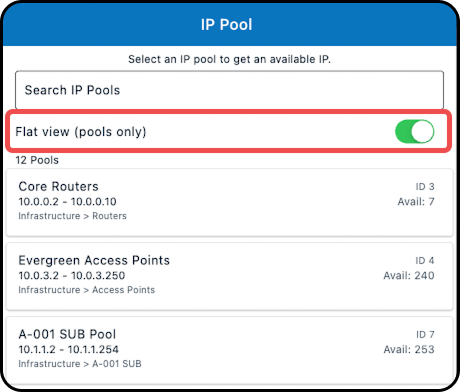 b) Select the 3 dot menu (from the Static IP field) to open the IP Pool Chooser window, where you can toggle between a flat view (that displays IP pools only), or a hierarchical IP view (that contains supernets, subnets, and pools); based on the selection made here, the IP address will automatically populate the Static IP field.