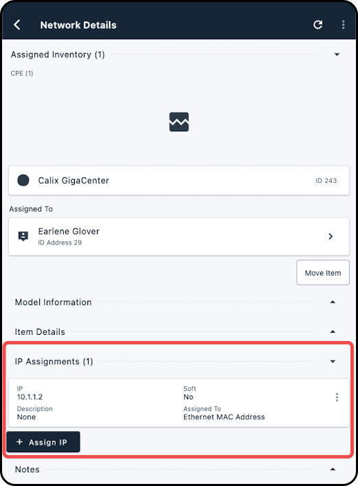 5. Within the Network Details screen, expand the Assigned Inventory section and scroll to IP Assignments.