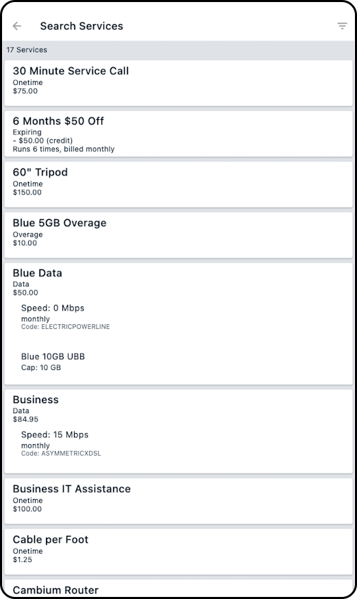 6. From the screen that appears, select the service that will be added to the account. This can be done by: