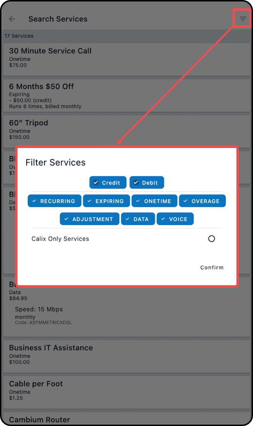 8. Tap on the filter icon and select "Calix Only Services"