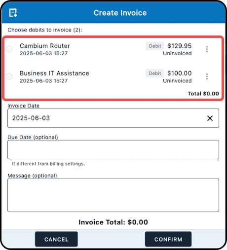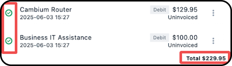 Once you select a debit (by tapping on it), the checkmark next to it will turn green; the Total and Invoice Total amounts will be updated to reflect the included debit(s).