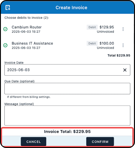 10. Tap "CONFIRM" to generate the invoice.