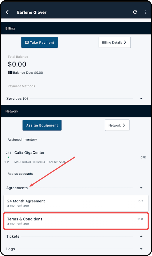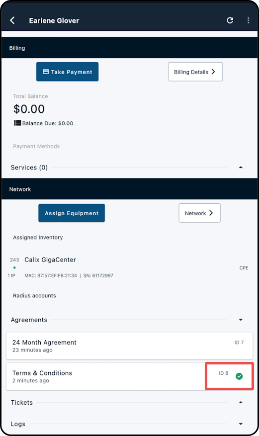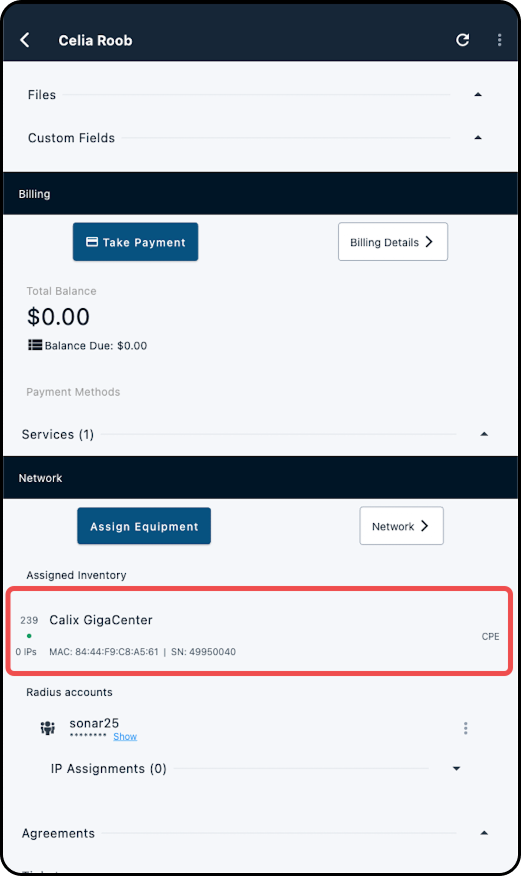 6. Select the desired inventory item to assign it to the subscriber's account. Doing so will return you to the account overview, with the item now assigned.