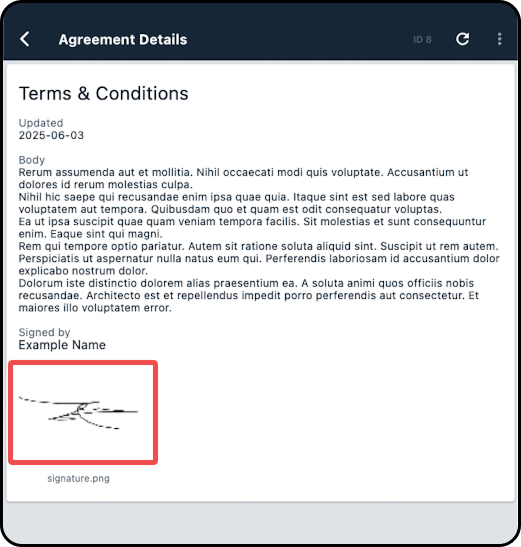 The signature will be attached to the account and will be viewable within the instance as well as on the Field Tech app.
