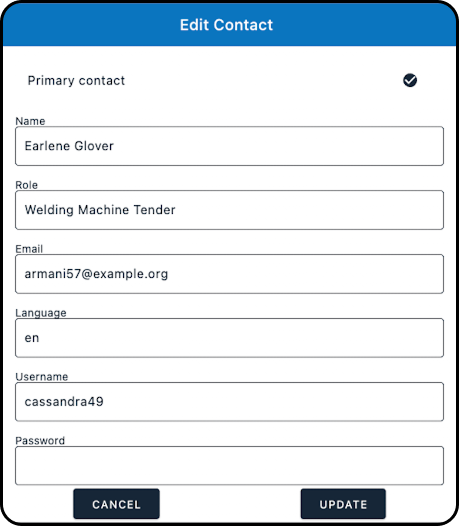b) Clicking on the 3 dots next to any existing contact and selecting "Edit" from the dropdown will open the "Edit Contact" modal, where you can modify the information for an existing contact: