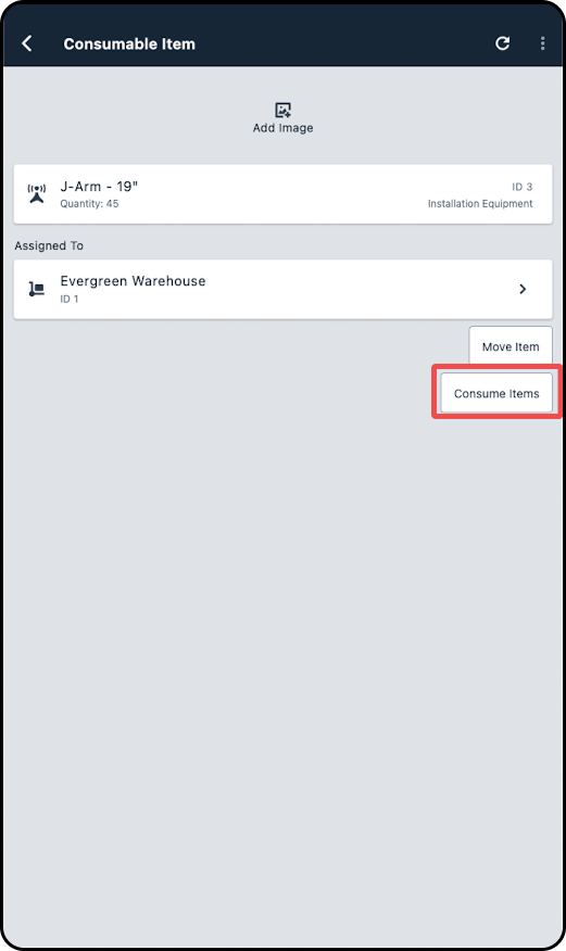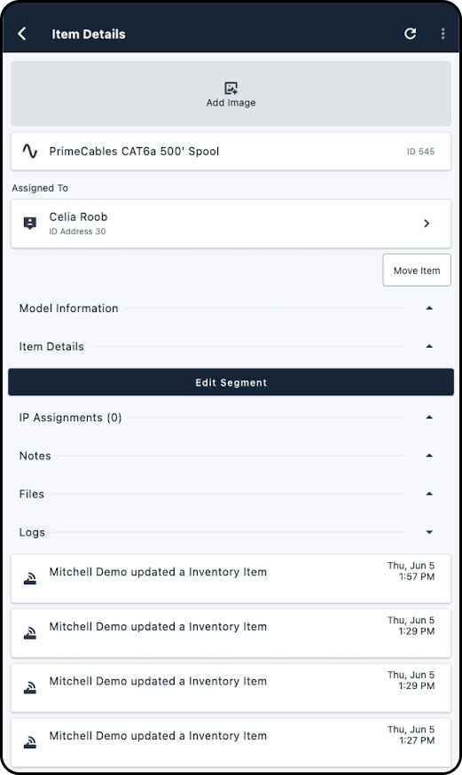7. Tapping on any inventory item listed under the ASSIGNED INVENTORY section for an account will navigate you into the Item Details page for that piece of equipment; from this page you will be able to view model information and additional details, as well as view and add IP assignments, notes, or files to the item.How to Consume Inventory