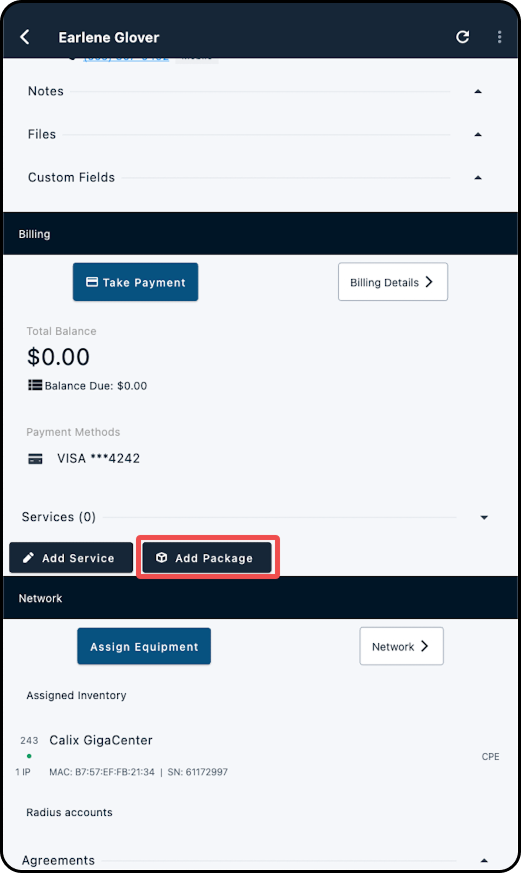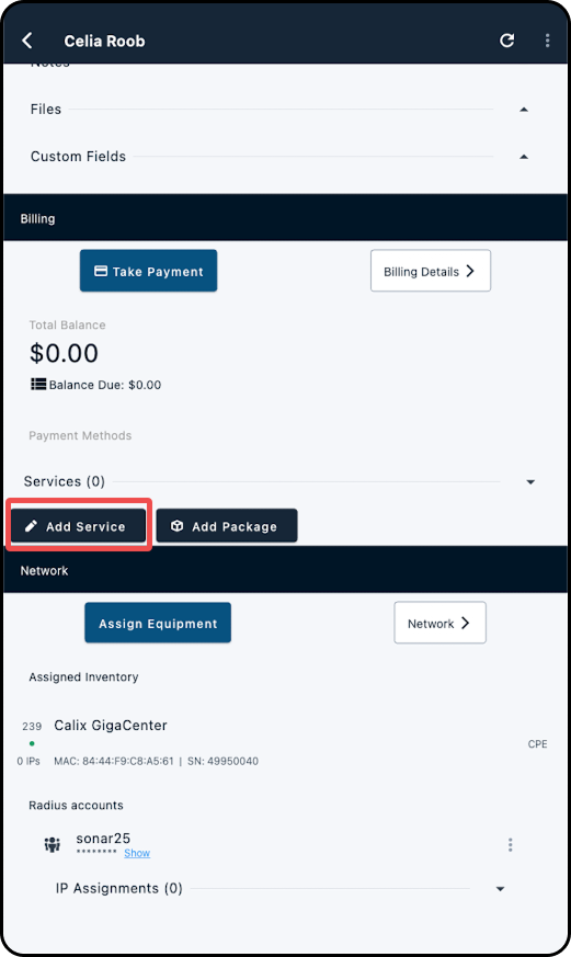 3. Because Calix SMx provisioning requires a mapped inventory item and mapped service, both needed to be added to the account for Calix Provisioning Details to generate.