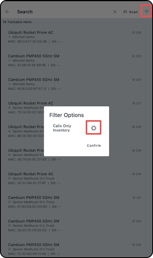 5. Tap on the filter icon and select "Calix Only Inventory"