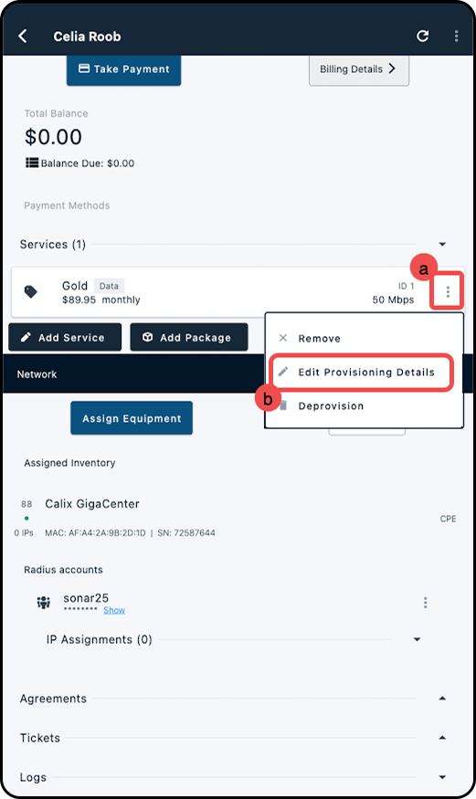 1. Expand the Services dropdown, and tap on the 3 dots for the Calix SMx-mapped Data service, followed by Edit Provisioning Details
