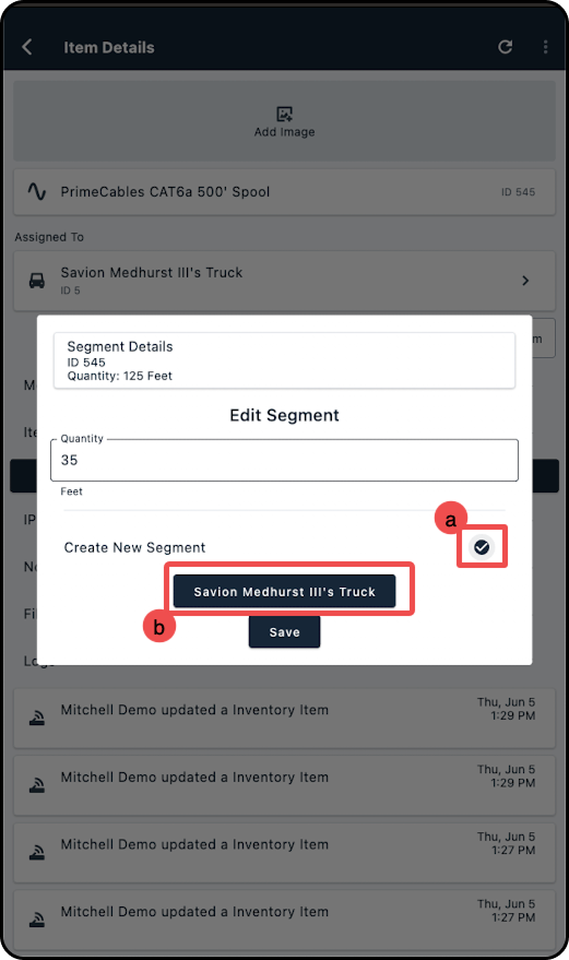 6. Locate the newly created segment and select it. This will assign the created quantity to this location for tracking purposes. If too muchn was removed from the original segment, the newly assigned segment can be further modified, ensuring only the exact amount used on the job is recorded.