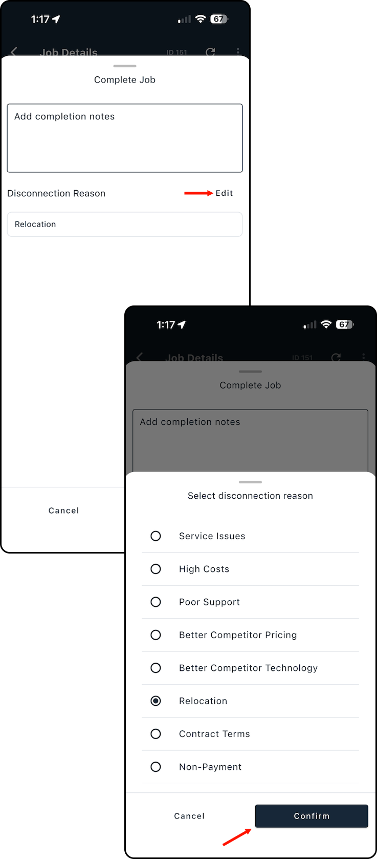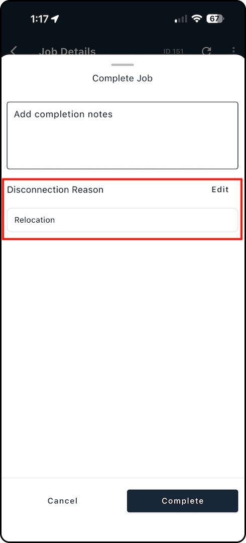 If Disconnection Reason is set as required, you won’t be able to complete the job until a reason is selected. Follow the steps below to add or edit the Disconnection Reason during job completion.