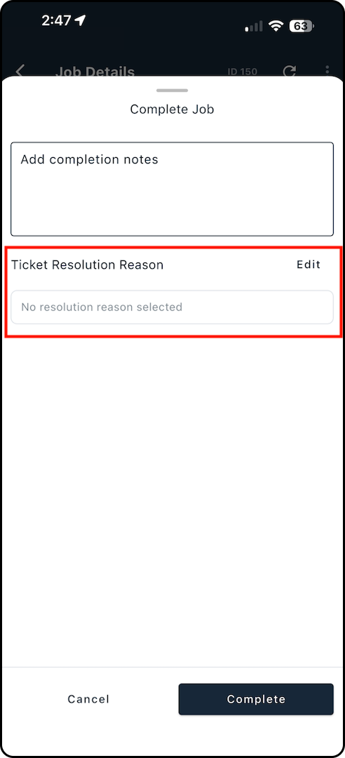 Follow the steps below to add or edit the Ticket Resolution during job completion.