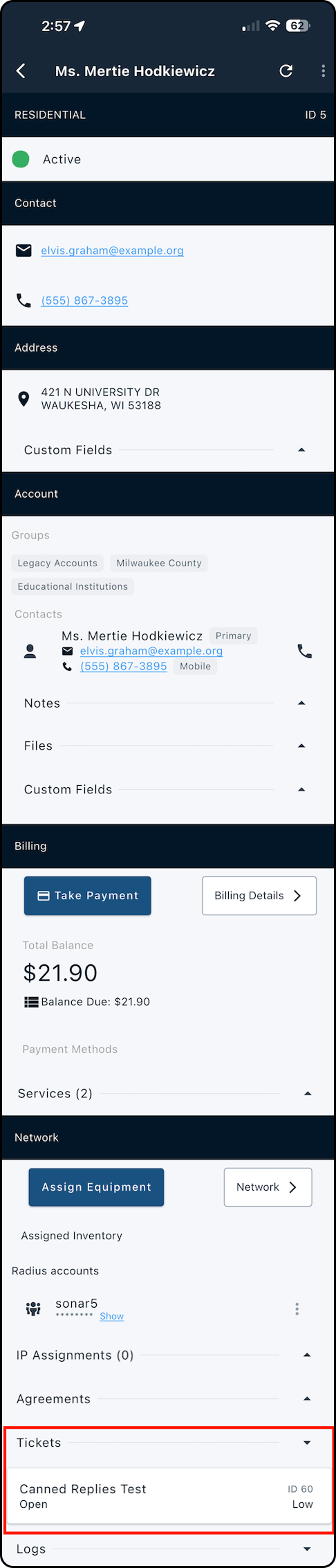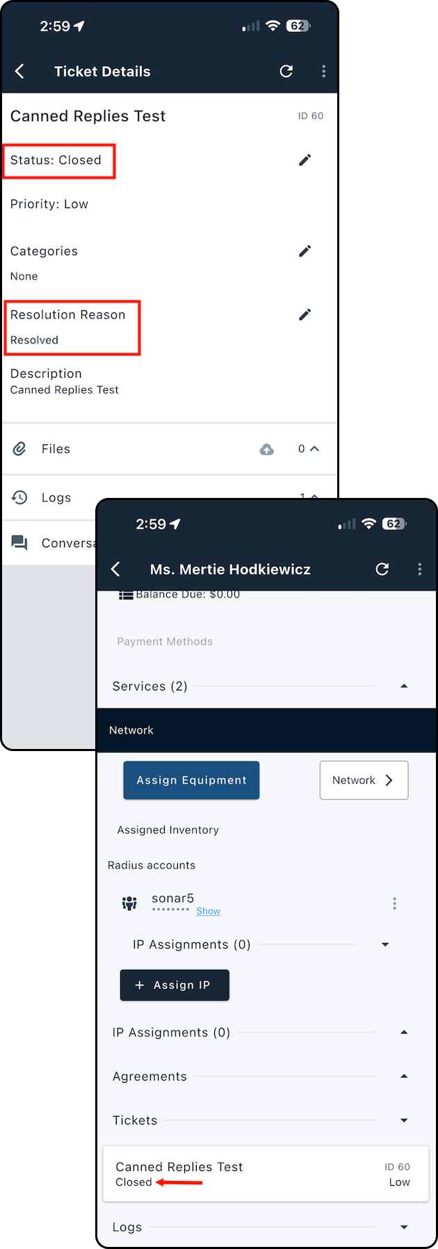 9. Verify the ticket shows as Closed on the ticket details screen and in the account’s Tickets section.
