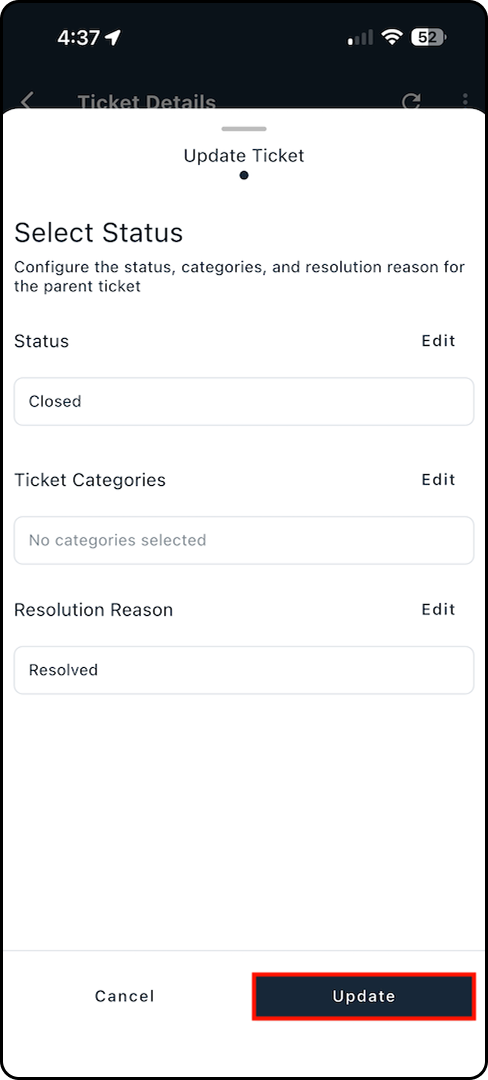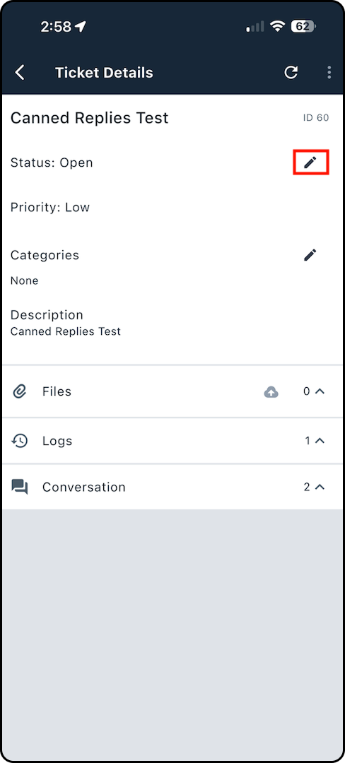 5. On the ticket details screen, tap the pencil icon next to the status option to edit the status.